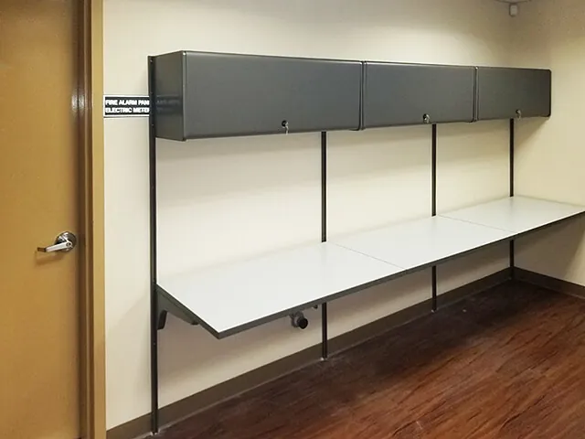 The patient services room has a small waiting area and a lab processing workstation with wall mounted storage units. 67”H cubicle partitions safely separate the patients from the lab equipment and samples.