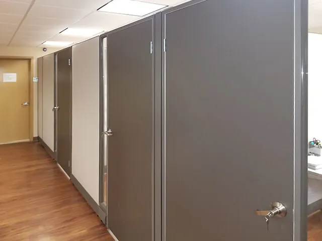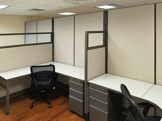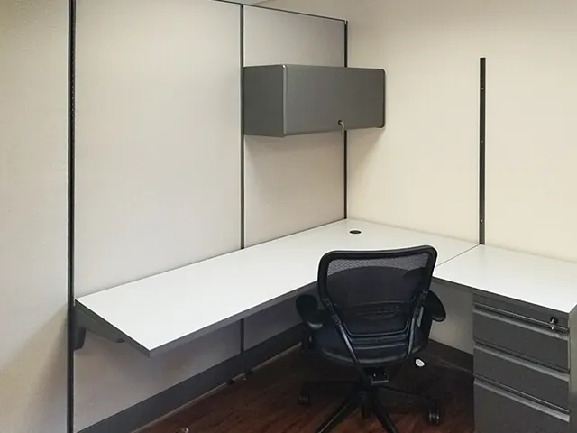 Our O2™ Modular Office System with neutral office colors from the Budget Program ticked all the right boxes for form, function, and price. 85”H fabric office wall partitions leave clearance for existing HVAC, lighting, and sprinkler systems in the 8ft office ceilings - not having to reroute these services saved the client money and headaches. Each private office cubicle stays secure with a locking cubicle door.