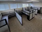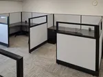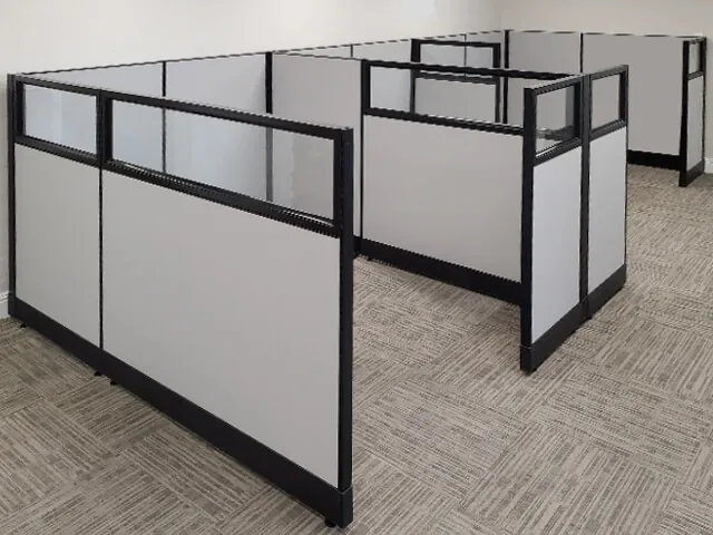 How to create privacy in an open plan office? Our longstanding client approached us to solve this puzzle for them with office furniture in Richmond. After some consideration, we utilized our versatile Modular Office Walls with windows to subdivide the space into a combination of office suites, workstation cubicles and office meeting rooms. Stylish black frames and light grey fabric panels were repeated in both the office modular walls and the cubicle panels for visual continuity.