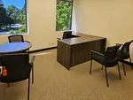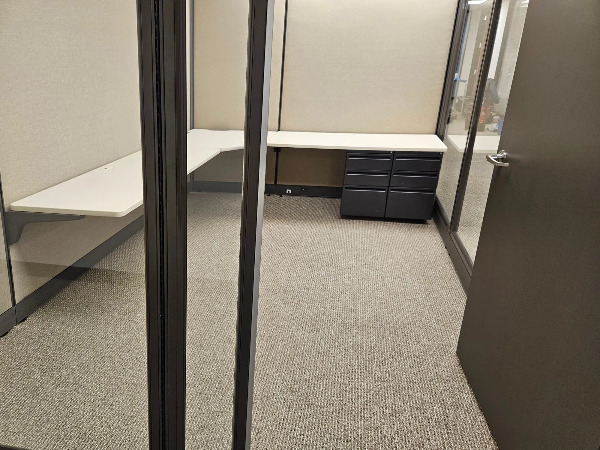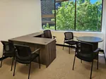 Adjacent to the cubicle space, we designed a compact yet functional conference room for four. Using the same modular office wall system, we enclosed the meeting area to provide a dedicated space for collaboration. The conference space was furnished with a round meeting table and four guest chairs, creating an inviting yet professional atmosphere. To maintain a sense of openness while ensuring discretion, we applied office window privacy film to both the new and existing glass office panels, achieving a frosted-glass effect that allows for light transmission while reducing distractions.
