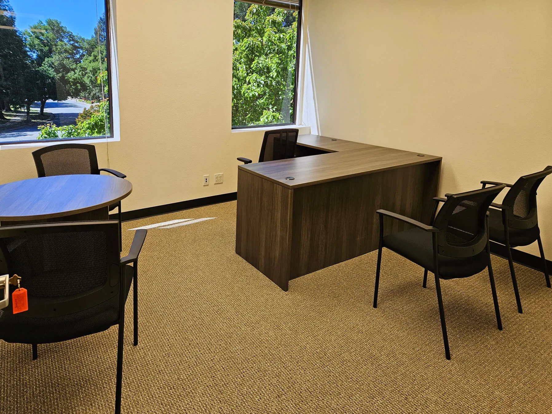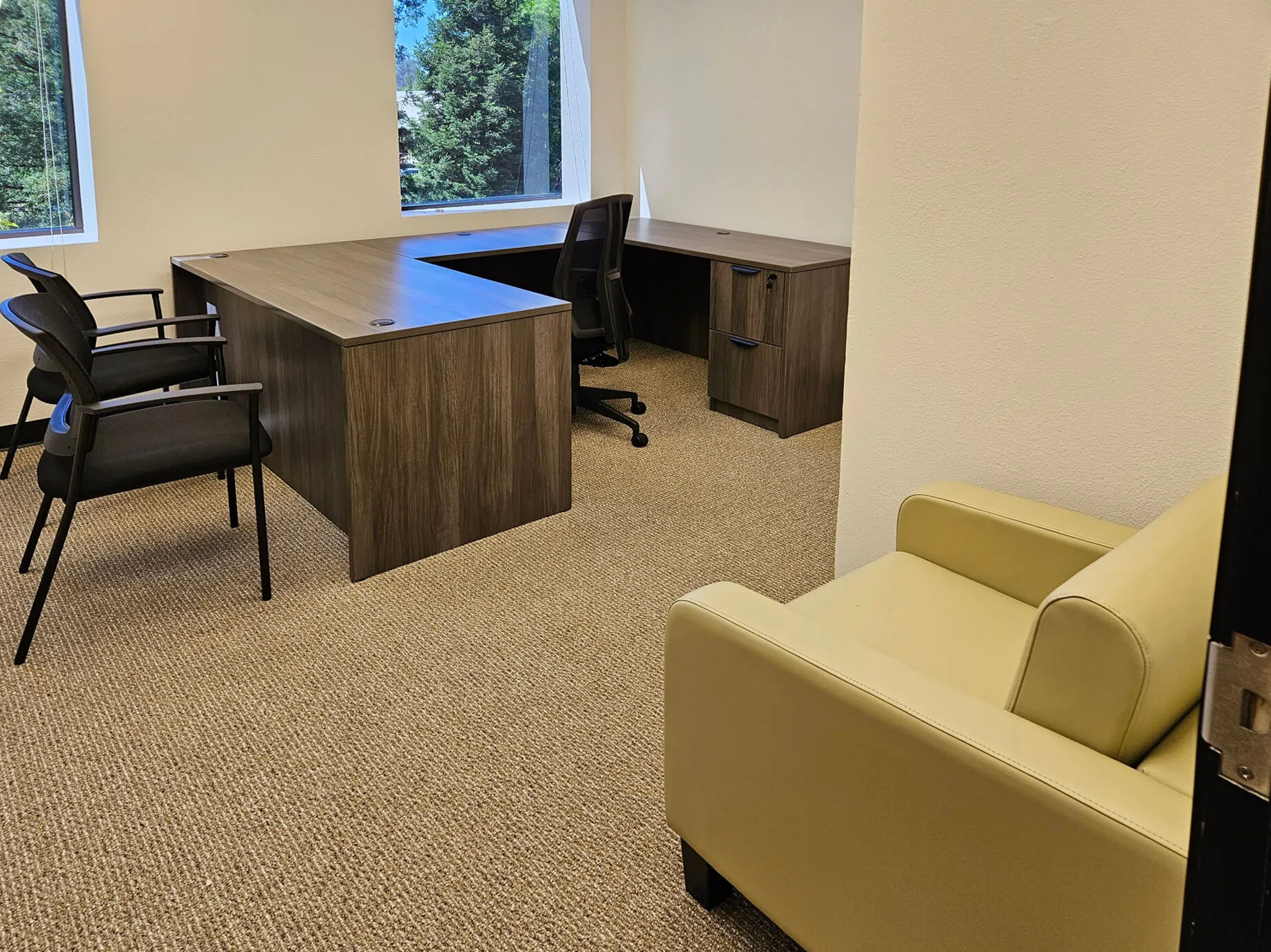 In addition to the cubicle workspace we furnished four private offices tailored to different needs. The first was an office for 2, featuring two L office desks, a round side table with chairs, and an office lounge area with additional seating. The second and third offices mirrored one another, each equipped with an L-shaped desk, a comfortable office chair for back-pain, and two guest chairs to accommodate visitors. The fourth office was designed as an executive workspace, incorporating a U-shaped office desk, a comfortable lounge chair for office, and a small meeting table, ensuring both function and sophistication in an executive office design.