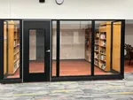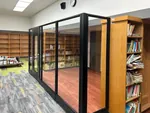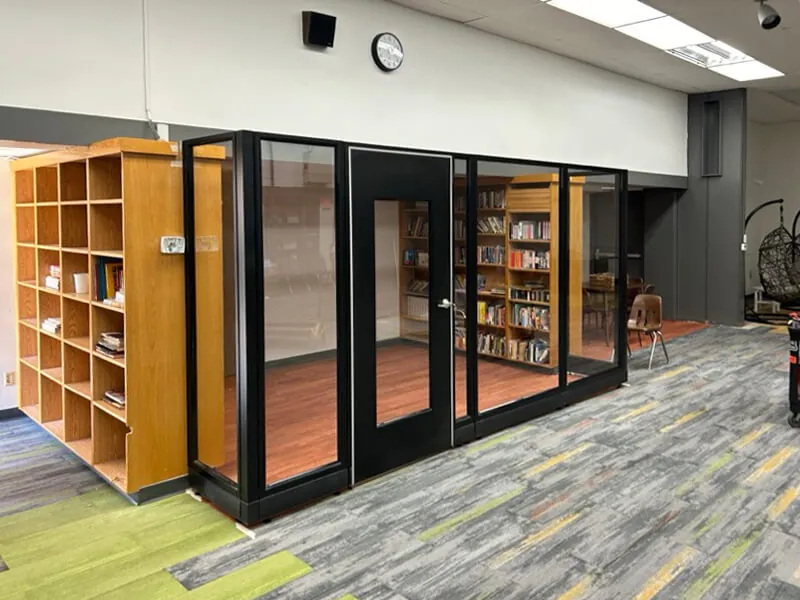 To achieve this, we installed modular office walls featuring black framed glass office panels to construct the library enclosure. The system was strategically connected to the client’s existing wooden office bookcases, ensuring a cohesive and functional layout with structural integrity. The design included a framed glass office door to provide easy access while perpetuating the sense of openness within the enclosed office space. By utilizing modern office design techniques, we were able to create a sleek, visually appealing reading environment that blends seamlessly with the school’s existing decor.