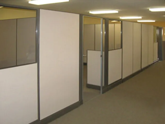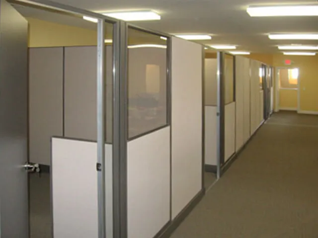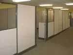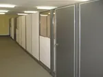 We secured fabric cubicle panels to the rear building wall to create office dividing walls. These office partitions not only provide sight and sound separation from room to room, but also conceal electrical and data cabling in the panel bases.