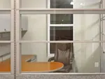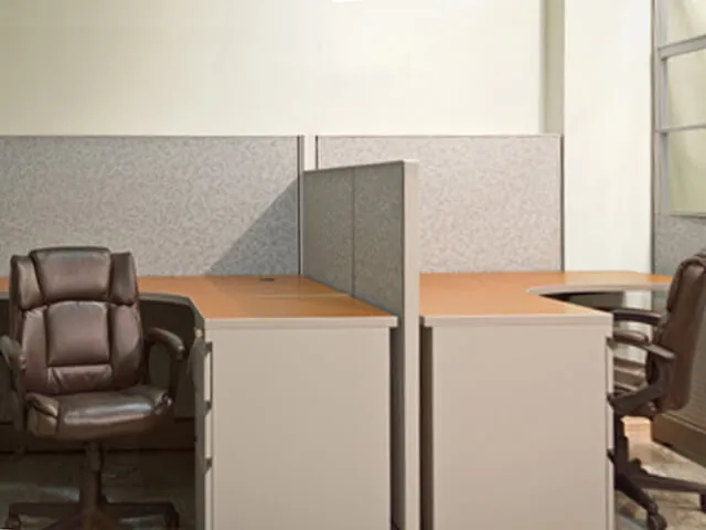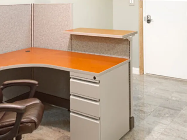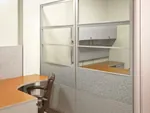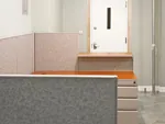 Inside this 9’x8’ semi-private manager’s office we fit an L-shaped desk with peninsula top, two tackboard panels with overhead storage bins, and office chairs for visitors.