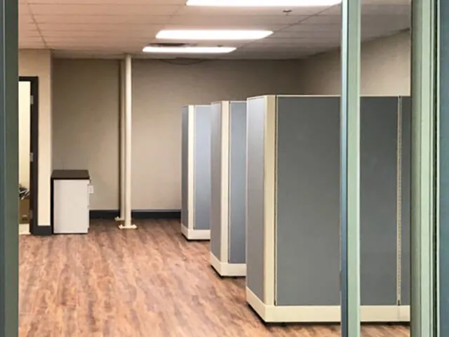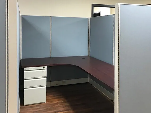 We configured the cubicle workstations inline against a wall, with 67”H divider wall panels (about eyelevel for someone of avg. standing height) that allow employees to focus on task-oriented work. L-shaped workstations include a box box file pedestal for personal storage.