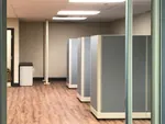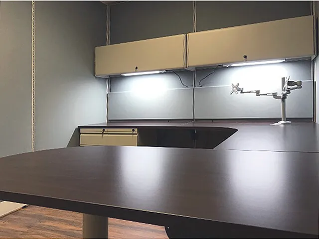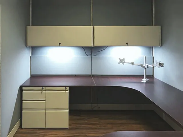 The manager required a private office with more visual and auditory separation than the open office cubicles. 95”H acoustic modular wall panels and a locking office door panel form a freestanding 8’x11.5’ rectangular office that stops just shy of the 8 foot high ceiling. Inside the small office is a u-shaped desk, overhead storage bins, drawer pedestals, office task lighting, and dual monitor arms.