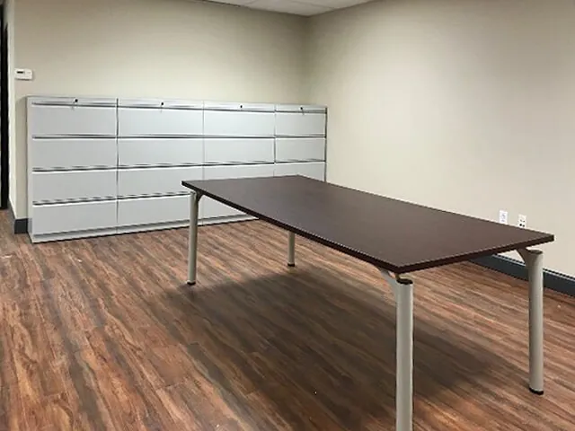 An 8-foot long, 8 person conference table has the same matching mahogany desk finish as the modular office desks and can be used for formal meetings and informal brainstorming sessions. Nearby, two 2 drawer lateral file and four 4 drawer lateral filing cabinets store large amounts of company papers & files.