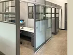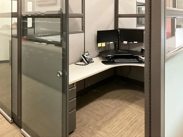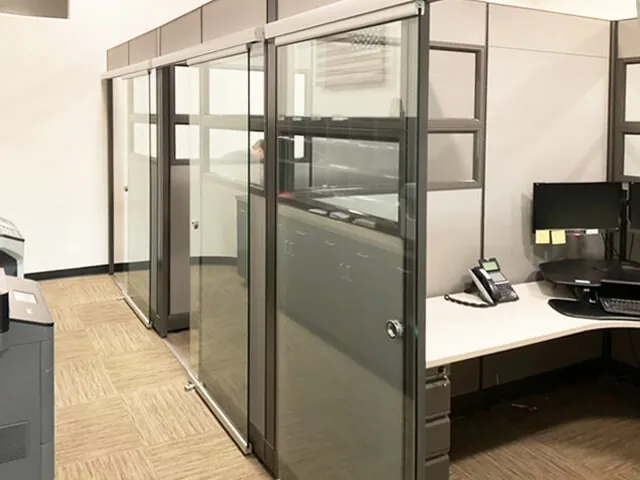 Our client was looking to achieve a high-end office look on a budget, using ordinary modular walls. Our design team used a combination of fully opaque fabric office panels and partially glass cubicle walls to construct the private offices. Chic frosted sliding doors were specified to add a sense of opulence to the office workstation. These office sliding doors act as a physical barrier for privacy yet introduce an element of visual transparency that optimizes the natural flow of light through the space.