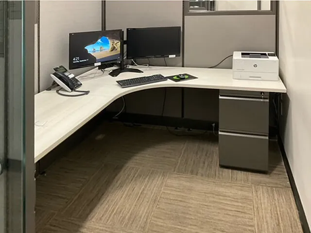 Each L shaped cubicle desk provides a wide desktop, which was teamed with a file file pedestal and a box box file pedestal, providing a sufficient office storage solution.