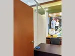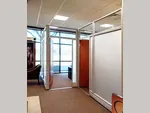 We used a modular office walls with door system in a second area of the office to demarcate an additional two private offices. A combination of frosted plexiglass panels with clear glass panel stackers and laminated doors were introduced into the corridor, again to promote the flow of light through the larger office space. In this instance the modular walls separating the offices are fabric office panels for an increased amount of visual privacy. We also created a custom sized fabric office screen to fill in the space above an existing built in cabinet.