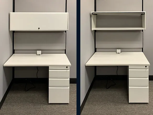 We provided these new offices with convenient office storage solutions by equipping each with a 4×2 straight office desk with an overhead storage bin with flipper door and a box box file pedestal. We also offer a multitude of desk accessories to customize each workstation, and in this case, the client opted for an additional office tack board for employees to pin up important notes and perhaps a photo of Fido.