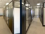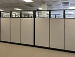 We utilized our practical modular office wall system with 9 feet tall fabric and glass office panels that allows light to flow unobstructed, to create 5 sizable private offices. Modular office walls are affordable, reusable, and easy to assemble, which them the obvious choice for this project. This system allows us to create enclosed spaces with little down time and without the hurdles of traditional building methods. They provide privacy and act as an acoustic barrier for focused work.