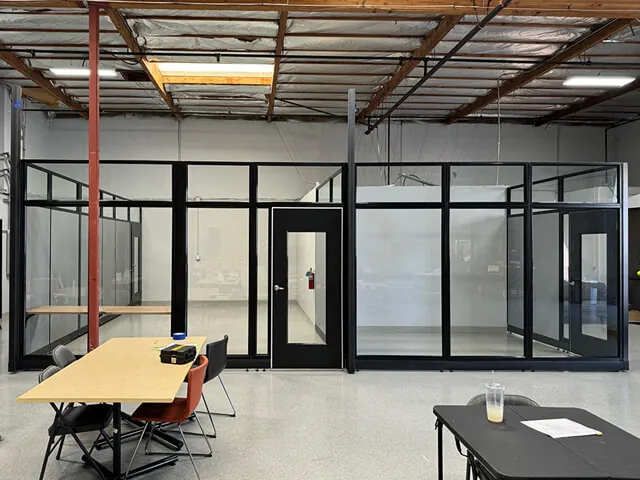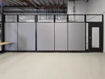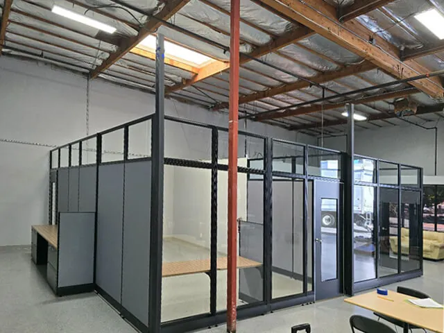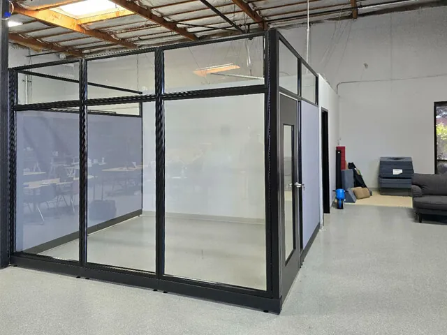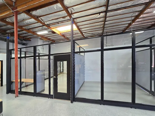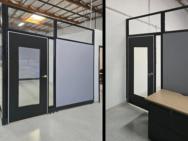 We recently completed a project in their office space in Milpitas, installing modular office walls to create two private spaces within an open plan office. This installation demonstrates the flexibility and practicality of modular wall systems in transforming open areas into functional workspaces. The tempered glass panels framed in black provide durability and structure, seamlessly integrating into the existing open layout.