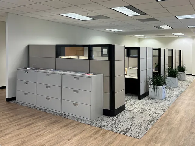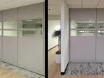 For the office side walls, we incorporated grey cubicle walls with two rows of glass stacking panels, topped with an additional row of grey panels. This innovative combination provides the ideal balance between visual connectivity and sound privacy, allowing employees to interact while still having dedicated, distraction-free spaces. The layout was carefully designed to complement a modern office design approach, ensuring both style and functionality.