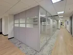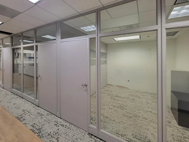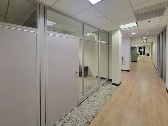 To achieve this, we installed our premium modular office walls, seamlessly integrating them with the existing structure. The 107” high office facades were designed using glass office panels with glass stacking panels, allowing for natural light penetration while maintaining a modern and transparent aesthetic. Each new private office space was fitted with a solid office door, ensuring privacy and a professional appearance.