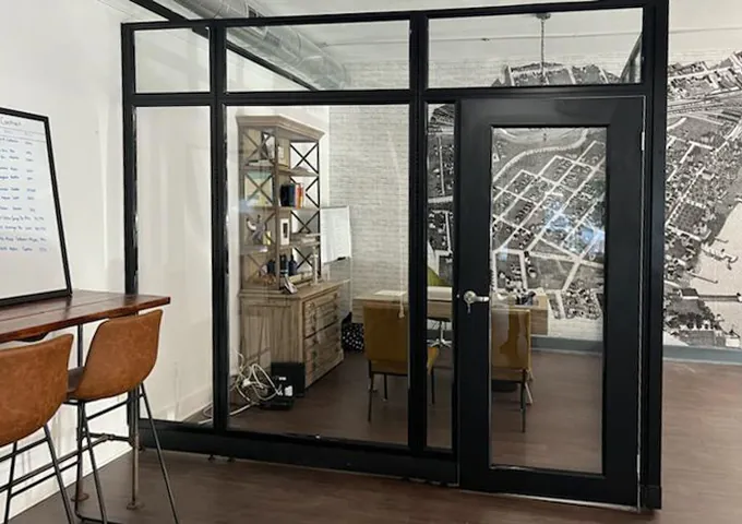 After our client moved into their newly renovated open office space, a need soon arose for a private section for conducting business where more sensitive information would be discussed. As they already spent a good amount of time and resources on finding quality office furniture in Jacksonville Florida and commissioned a statement custom wallpaper mural, it was imperative to keep the new office as transparent as possible, to showcase their contemporary office interior.