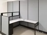 We secured the tall office partitions to existing demising walls with simple mounting hardware. They double as cubicle walls for the L-shaped workstations placed on either side, which also include 47”H and 53”H partitions with glass stacking panels as part of the cubicle configurations – enabling co-worker collaboration.