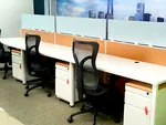 We provided a simple 6-person workstation using the Optima™ benching system. The elegant creamsicle office color scheme fosters a fresh and modern office space. White desk tops keep the workspace light, bright, and typical of a trendy office environment, and the apricot desk partition fabric complements the apple green office wall. Fruity!