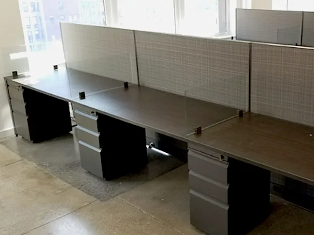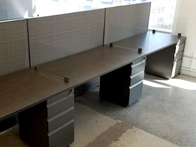 In their beautiful industrial style modern space we've incorporated benching desks from our O2 Optima line to achieve a sleek, elegant, and affordable look. In order to provide elements of privacy and to define individual work spaces within the concept of an open office layout, we used semi-private 53"H fabric panels and clear plexiglass desktop dividers.