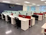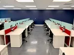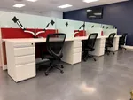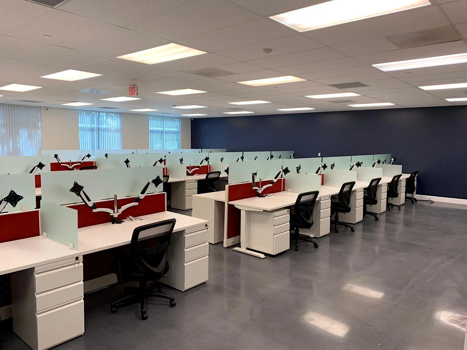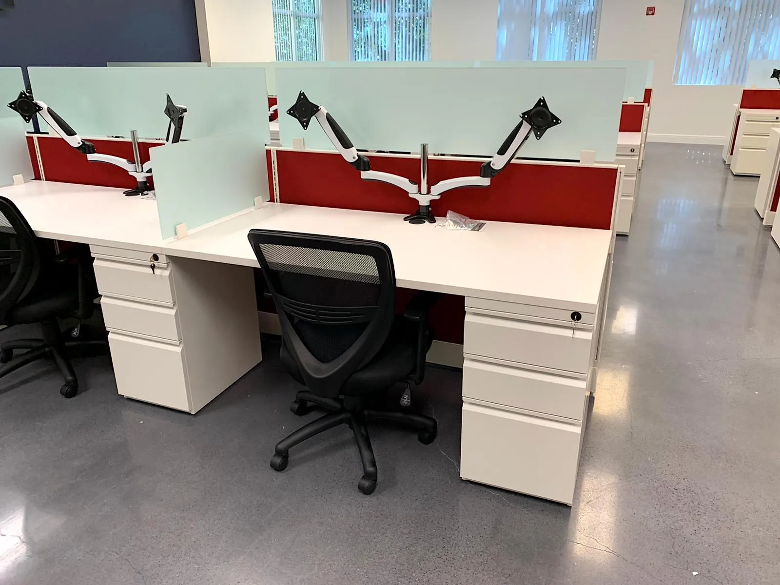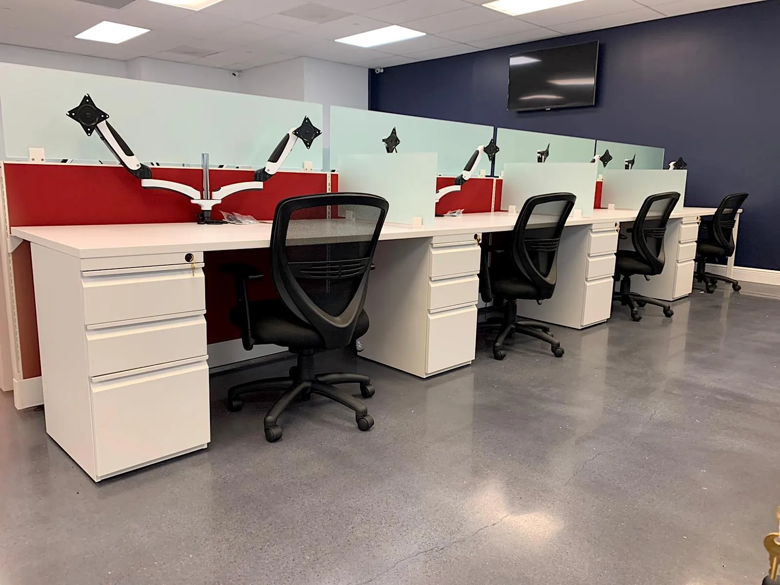 After weighing the options the client fell in love with Optima Open Office Workstations, a panel system with a lean design, 3 week lead time, and attractive office furniture costs. Each 30x60 desk gets a 3 drawer file cabinet with lock, dual monitor arms (desk mount), and frosted glass dividers. The white office furniture is contrasted by bright red cubicle fabric walls and dark blue office accent walls, a near perfect match to their corporate logo colors.