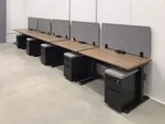 We specified these panels in “Ash” grey to form a continuation of the existing office color scheme and paired them with a warm “Walnut” laminate for the desktop surfaces, adding a sense of warmth to the overall office interior design.