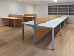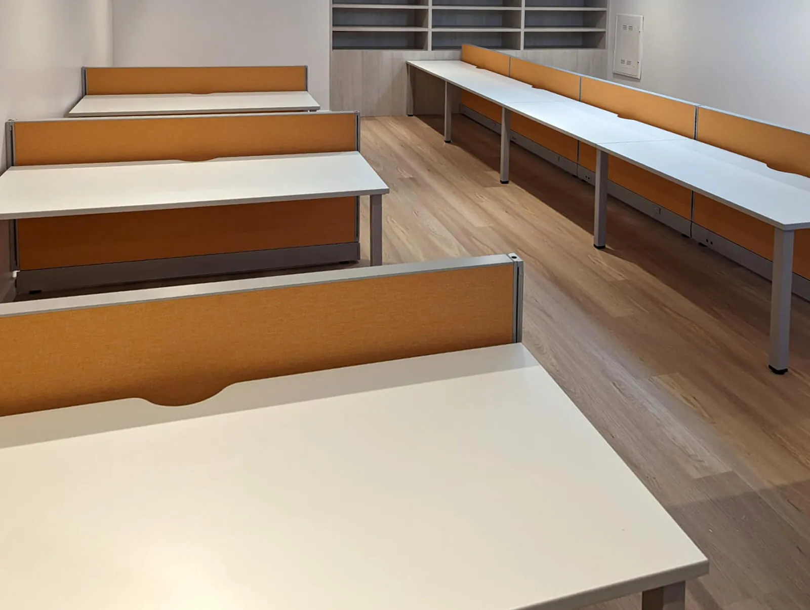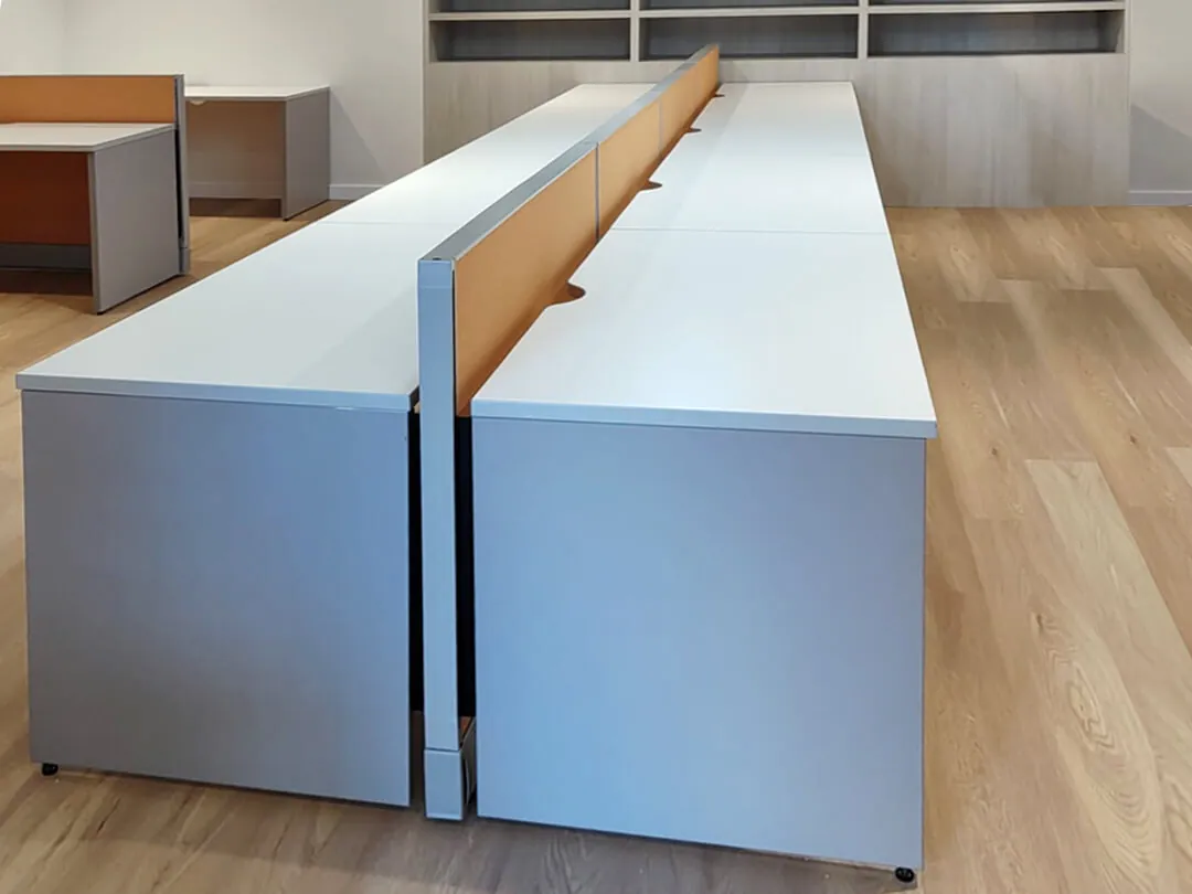 These versatile office benching desks not only serve as individual workstations but also helped create a collaborative workspace designed to foster teamwork and communication. Strategically positioned to encourage interaction, this area is equipped with powered components, ensuring convenient access to power outlets for seamless device usage and enhanced productivity.