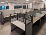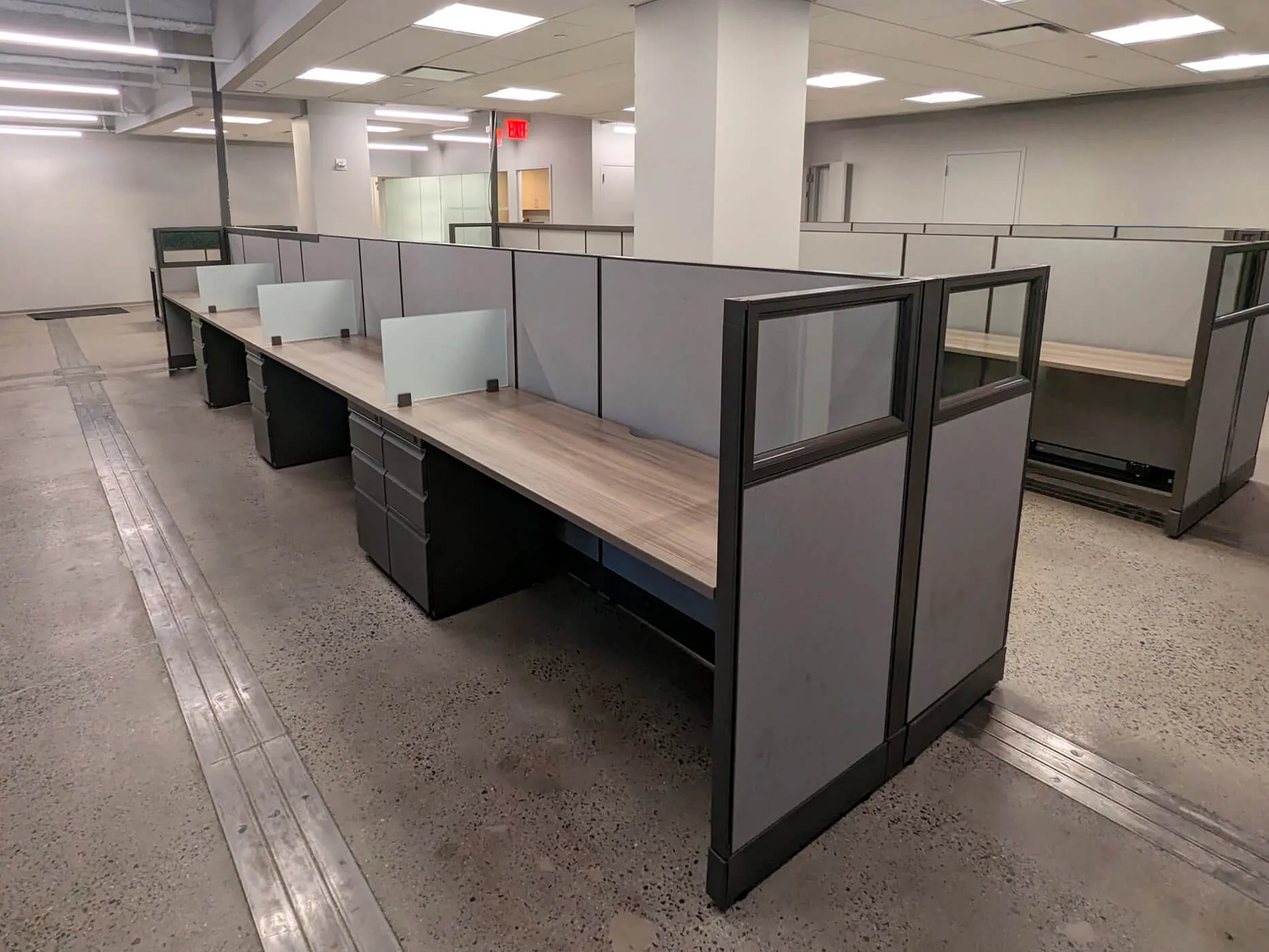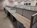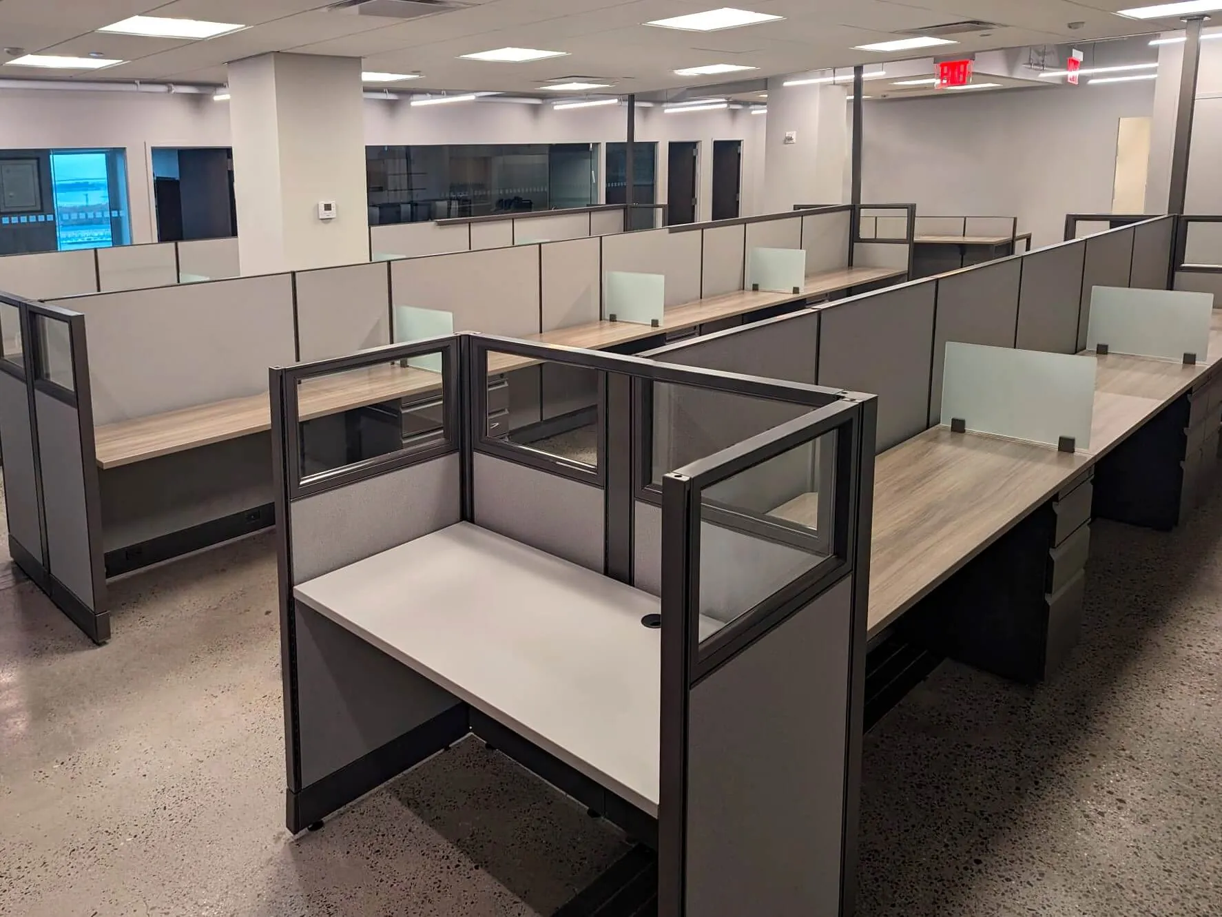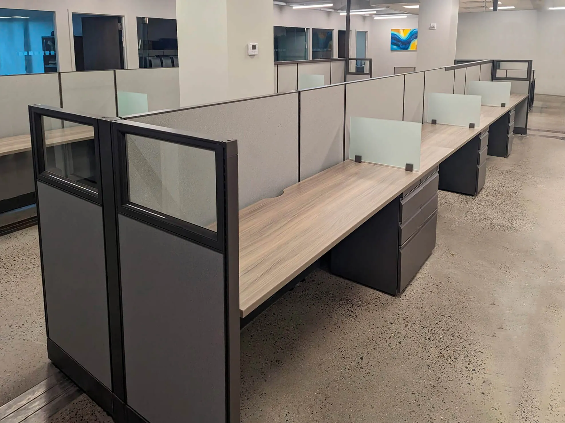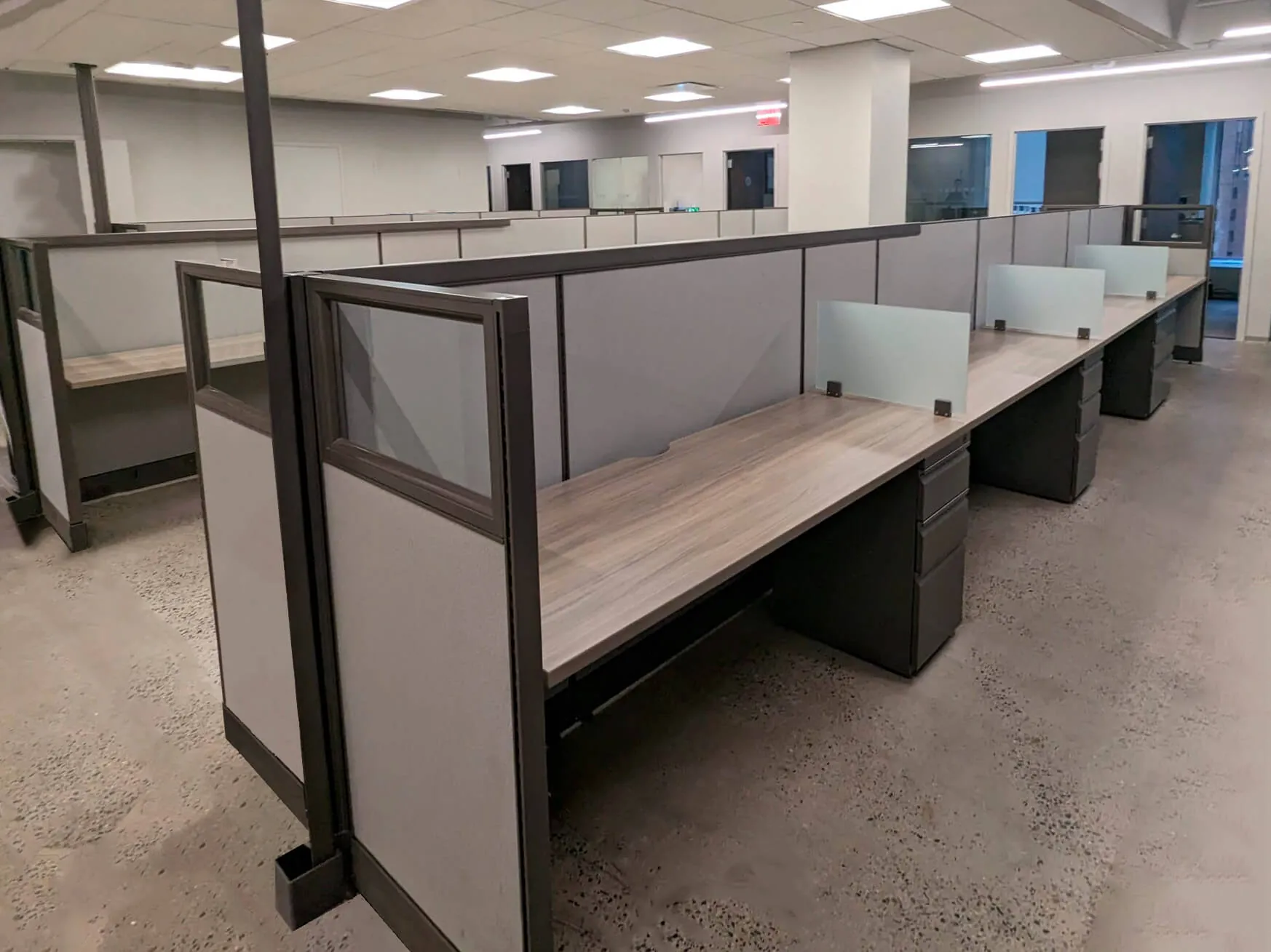 The second and third open office spaces were designed to foster collaboration and adaptability. To achieve this, our office space planners replaced outdated cubicles with 25 and 23 modern workstations, respectively, each featuring a box box file pedestal for storage. The 53” high workstation walls and frosted glass screens offer privacy for focused tasks while maintaining an open, contemporary aesthetic. This office benching system maximizes space utilization, accommodates team growth, and promotes mobility among employees.