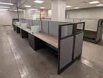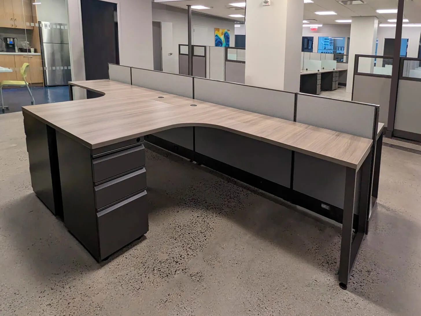 The first open workspace was optimized to provide additional worksurface and storage without compromising space efficiency. We replaced the existing workstation desks with a cluster of four L-shaped cubicles, each equipped with a box box file pedestal for organized storage. The 39” fabric panel walls define individual workspaces while maintaining an open atmosphere for seamless communication.