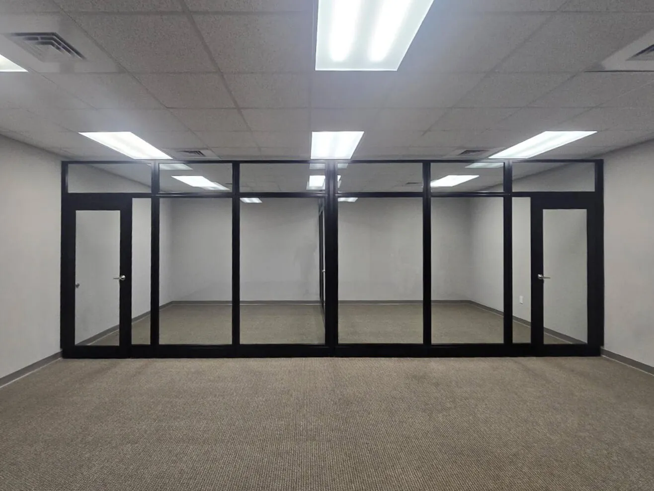 Each suite featured enclosed modular offices measuring 10'x9', 10'x10', or 12'x11'-8", built with 107"H and 103"H system panels. Hinged solid or glass-insert doors reinforced individualized access.