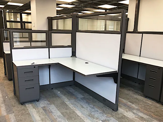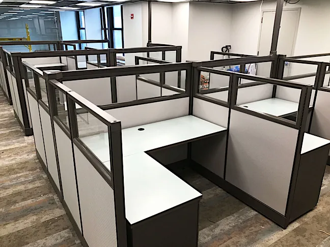 O2™ is a highly flexible cubicle system and able to meet both challenges. With a few office layout tricks we created 4.5’x5’ small cubicle configurations to fit the space available. Tall 85”H modular cubicle walls divide the office area into 3 spaces, and a locking cubicle office door adds more security to payroll. We created physical, yet transparent barriers by stacking an impressive amount of cubicle window tiles.
