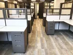 Integrated power & data runs through the panel bases along the floor, either pulled from the wall or the ceiling via office power poles. The client wanted additional cubicle cable management at desk level. We added a Panduit raceway system that routes cabling along the tops of the cubicle panels, providing arms-reach connection points in the corners of each desk space.