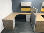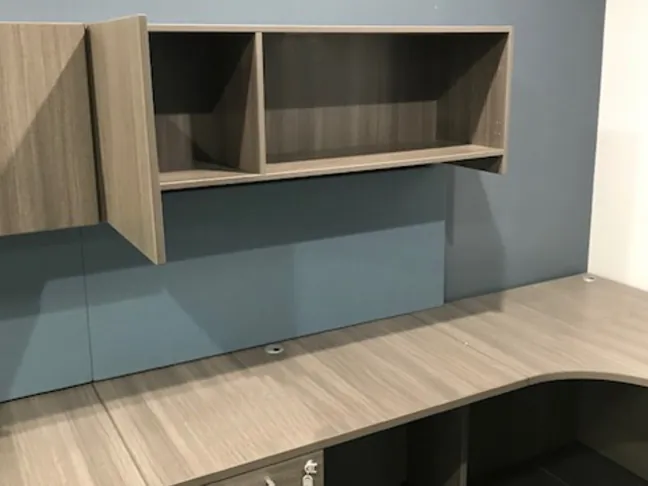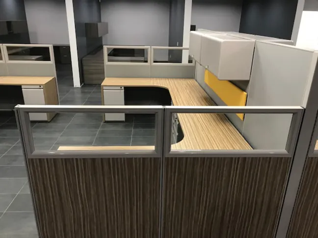 We classify this as a “semi” open office layout because the client still wanted a degree of privacy to break up the space. We honored this request by using high panels in between bullpens and short panels along the aisles. We built these office workstations with our O2 line of Herman Miller clone.