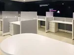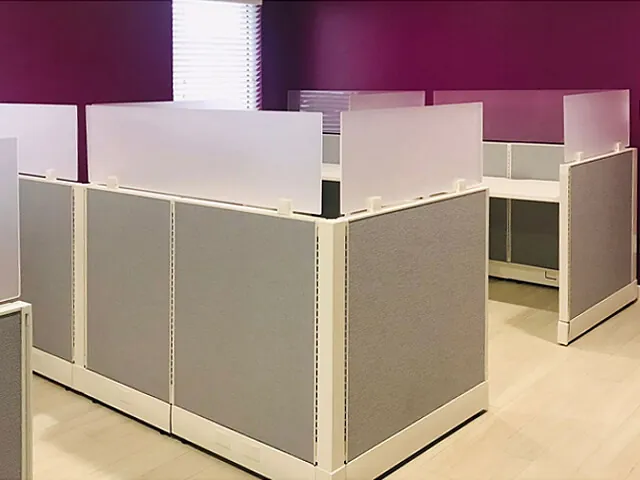The three existing open office spaces were equipped with several white cubicles, light gray powered low cubicle walls, frosted plexiglass office partitions, for the right amount of privacy and a white office pedestal for storage space. The use of these pieces kept the view open, which gives the idea of spaciousness. The color choice of the office stations, as well as the black guest chairs upholster, was the perfect match for the existing palette in shades of purple, corresponding to the corporate office colors.