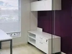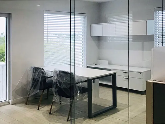 Their office space in Florida has two executive office suites, featuring white U shaped desks with a floating office desktop and black metal square desk legs. This neutral combination of colors and the simple-line shaped legs, bring sophistication to the rooms. Also, with functionality in mind, office credenza with drawers, and a wall mounted overhead office storage bin were installed.