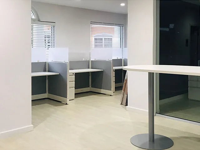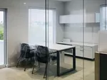 In the middle of the floor plan, a white office bar height table and a bar stool height office chair setup were placed, creating a relaxed open meeting office space.