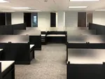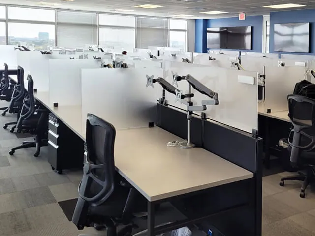 Because the amount of available office space was substantially less than desirable for the NOC and SOC units, we were forced to take a different design approach. Our office space planners opted for a straight desk design for the cubicle desk setup in the second phase. Dual monitor arm mounts were used to free up the limited desk surface space and frosted desk screens create sufficient privacy for focus work.
