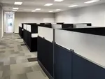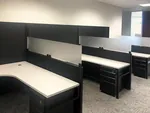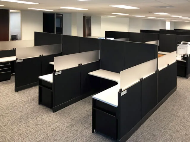 High cubicle walls in the cluster spines divide office space into smaller areas. We also added low cubicle walls at the entry of each cluster with frosted office screens, to further divide the cubicle workstations.