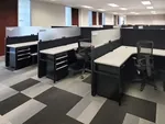 The furniture color palette is composed of Anchorage Onyx for the office cubicle panels, desk legs, and mobile pedestals, and Satin Stainless white for the desktop surfaces. This contrasting combination of material colors and finishes delivered a sleek, yet sophisticated office look for everyone to enjoy.