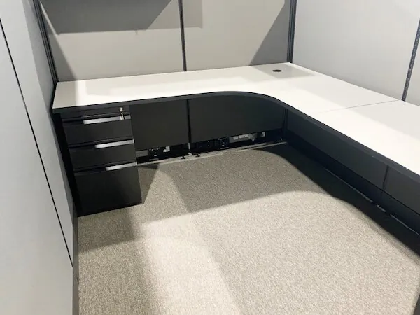 Each workstation consists of an electric sit and stand desk and a stationary straight desk combination in an L shaped configuration, offering a spacious worksurface to perform daily tasks with greater comfort.