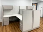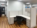 The client approached us to optimize a small open plan area in their office space in Boston. Our experienced team of office space planners were able to successfully fit three sizeable cubicle workstations into their somewhat limited office floor plan. These desks were carefully designed to be configured with fabric office panels of different heights and sizes, to meet our client’s requirements exactly. Tall cubicle walls accommodate overhead storage bins with flipper door panels and low cubicle walls permit visibility between employees, to foster a collaborative workspace environment.