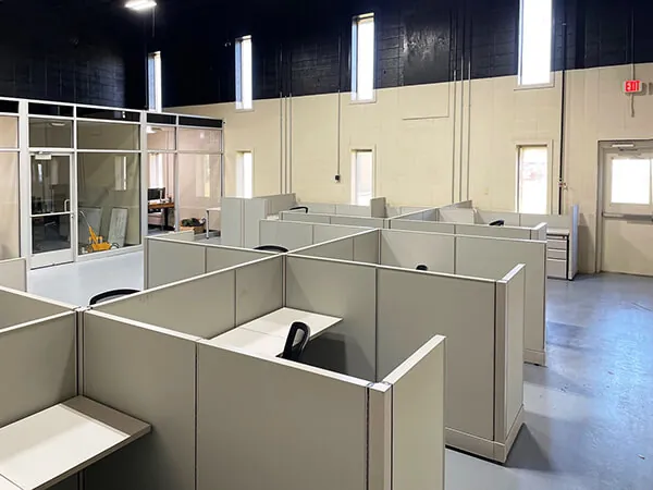 This modern warehouse office design interior is flanked by private offices on the one side, creating a residual wide open office area. Our client sought to furnish the open plan office with comfortable South Carolina office furniture.