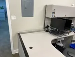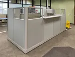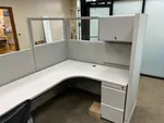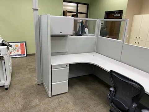 In this project we combined 2 L shaped cubicles to create a larger U shaped cubicle offering an extremely spacious worksurface that’s comfortable for two people working side by side. This workstation consists of a combination of different height cubicle partition walls. Tall cubicle walls accommodate an overhead storage bin, an office cubicle shelf and an office tack board, while stacking glass panels aids in visibility. A transaction top in the center of this workstation facilitates exchanges and serves as a reception office desk.