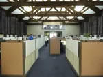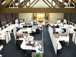 Our creative-industry client was attracted to the idea of using curved office desks to create a dynamic workplace unlike conventional offices with a mundane grid-like cubicle farm. Our office designer was thrilled with the opportunity to transform a rectangular office space into a lively and inviting workplace.