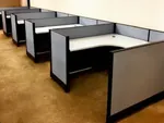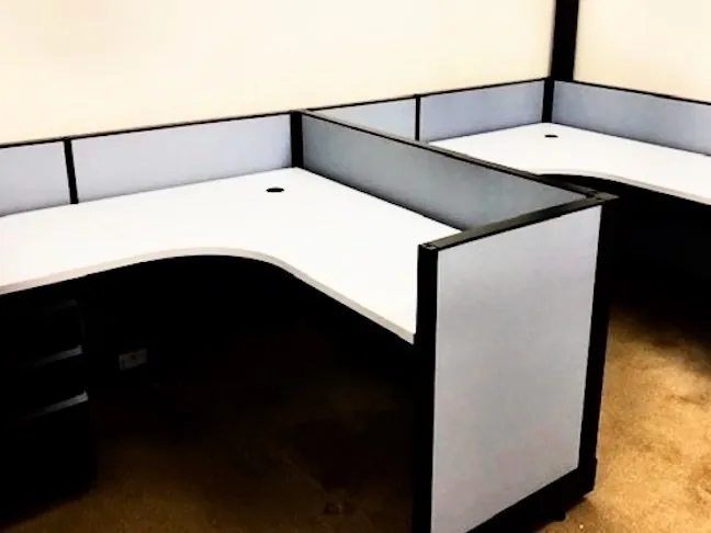 Each work cubicle has integrated data & electrical access, an ergonomic curved desktop, and an under-desk file cabinet with lock and key.