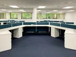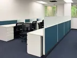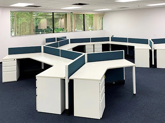 The open office design was populated with two styles of cubicle workstations: v-shaped desks and small straight desks. Our office space planners arranged and clustered the 120 degree desks in various ways, generating a dynamic and unique office space. All cubicle desks are accompanied by comfortable, lightweight, black mesh office chairs.