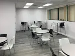 We set out to create an easy-going atmosphere in the office breakroom with some fun, lightweight black and white canteen chairs, and a combination of standard height tables for four, and round bar height tables seating two. These tall tables on the perimeter of the canteen space, offer a serene view of the lush outdoor greenery, ideal for spending a few moments to unwind in this relaxing office space.