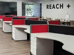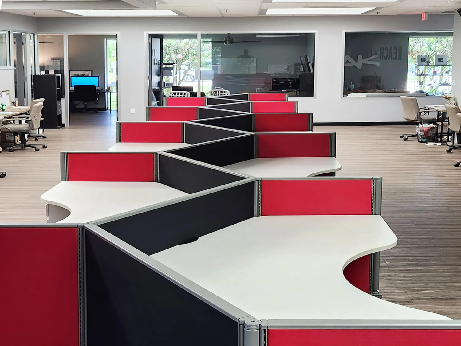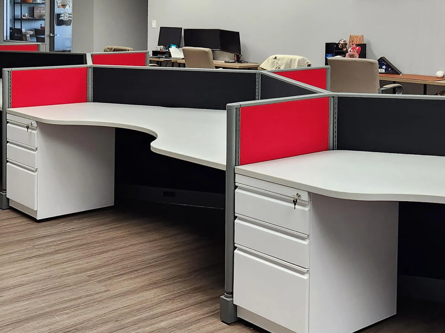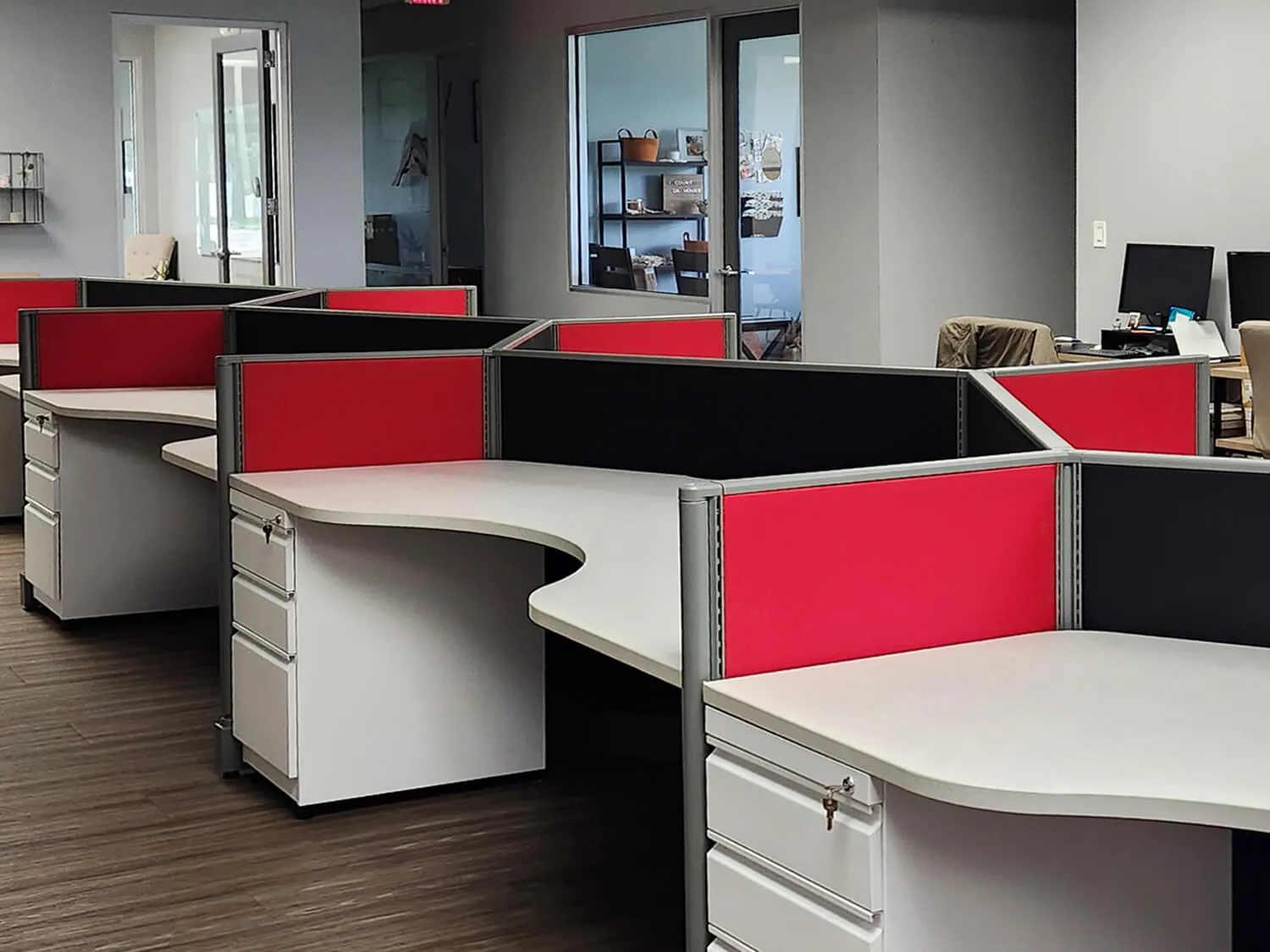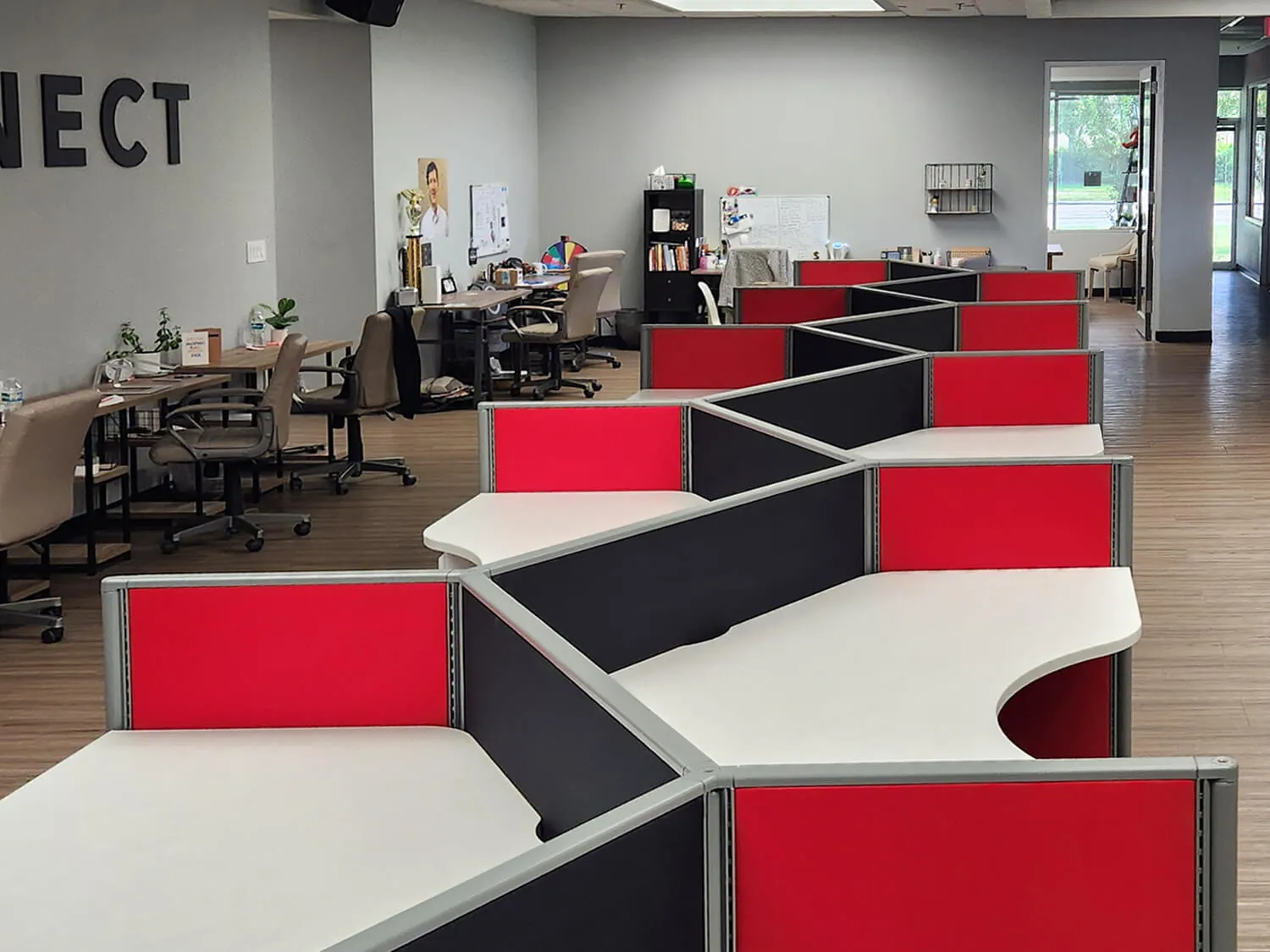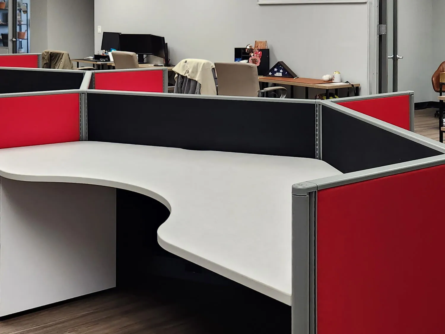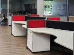 Hibiscus-finished cubicle partition walls, serve as a striking focal point, adding a contemporary touch to the space. Constructed from high-quality materials, this durable cubicle system is complemented by sleek white office desks, creating a clean and professional aesthetic. The result is a well-equipped workspace that seamlessly blends functionality, comfort, and modern design.