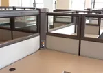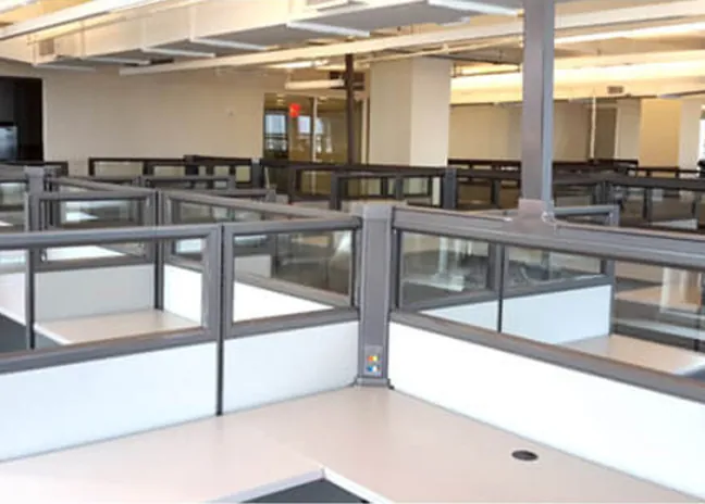 39” low cubicle walls with 14” stacking glass cubicle panels create work boundaries while allowing the natural daylight to filter through, for a bright office interior.