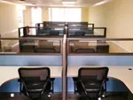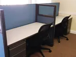 At the back of the room are slightly larger L-shaped workstations for the supervisors, who can easily see through the eye-level cubicle windows to keep an eye on the day’s activities & productivity.