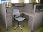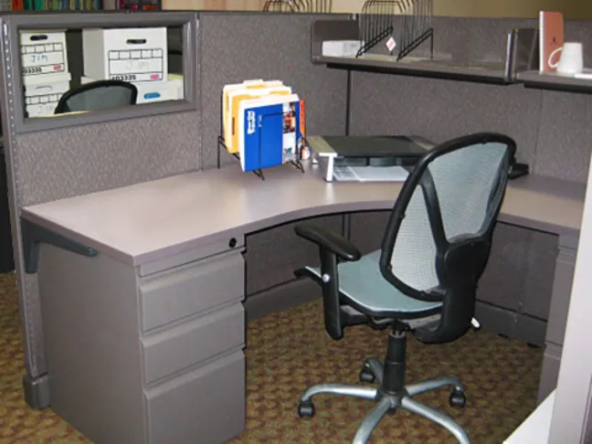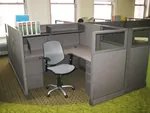 We proposed these neutral, monochromatic workstations to make sure that the coolest, brightest, most eye-catching thing in the space was their own carpet and flooring designs (check out that cool green footprint carpet!)